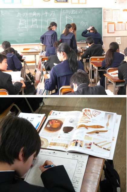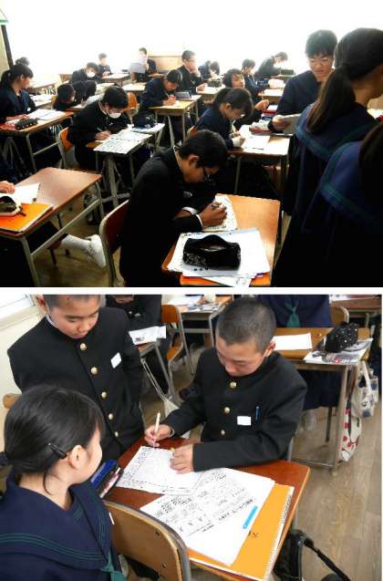 1年生の美術では、彫刻刀で木彫レリーフを作ります。そのデザインを考えているところです。部活動をモチーフにする人が多いようです。