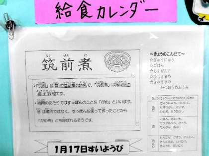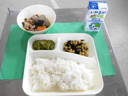 今日の献立は、ごはん、牛乳、ひじき豆、筑前煮、きゅうりのカツオ梅風味でした。