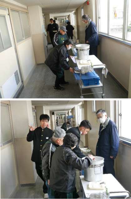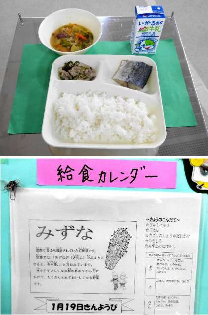 今日の献立は、ごはん、牛乳、さごしの醤油だれかけ、みそしる、みずなのにびだしでした。元気アップボランティアさんありがとうございます。