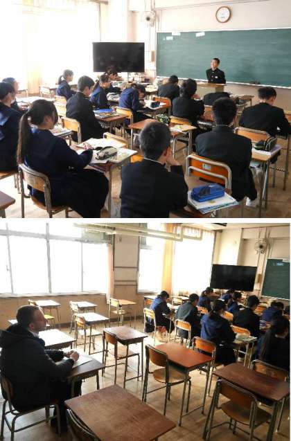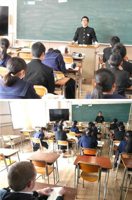 1年生の英語の授業です。皆の前で英語でスピーチをしているところです。後ろでは、ネイティブのダニエル先生がチェックしています。うまく自分のこと伝わったかな。