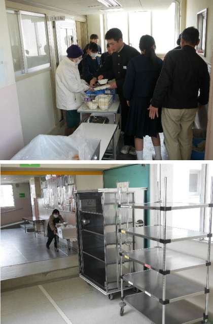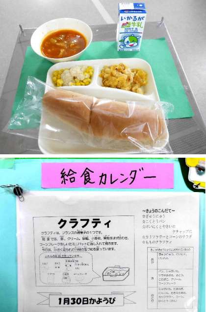 今日の献立は、黒糖パン、牛乳、鶏肉と野菜のケチャップ煮、カリフラワとコーンのサラダ、桃のクラフティでした。給食の後片付けにいつも元気アップボランティアさんがきてくれています。廊下で本当に寒い中を重たい食器を片づけていただいています。本当にありがとうござます。