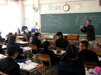 1年生の数学の授業です。立方体の問題を解いています。先生もバーをとりだして見せてみて生徒に質問しています。わかるかな!