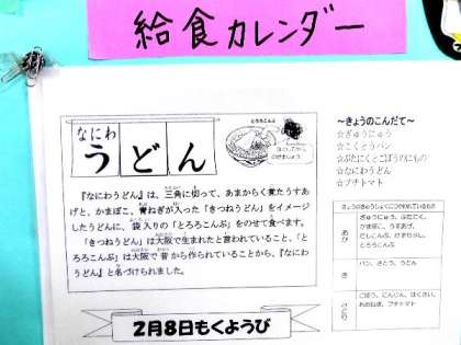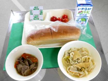今日の献立は、黒糖パン、牛乳、豚肉とごぼうの煮物、なにわうどん、プチトマトです。なにわうどんには、とろろがついています。寒い冬に、温かいうどんはおいしいですね。