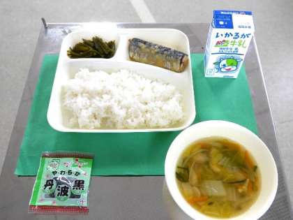 今日の献立は、ごはん、秋刀魚のみぞれかけ、ごもく汁、茎わかめの佃煮、牛乳でした。