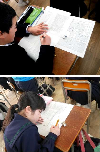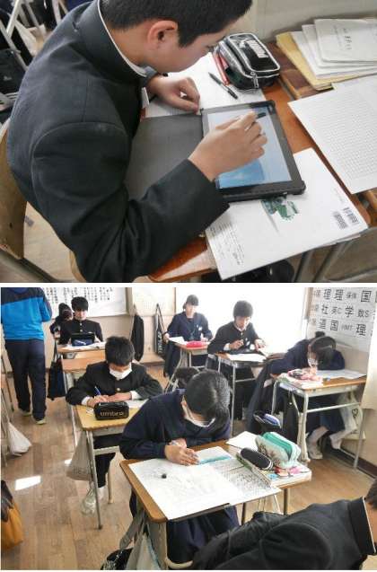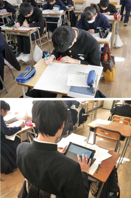 2年生が、記事を集めて新聞づくりをしています。文字数にあわせて記事を書くのはむずかしいけど、要約をしっかりする練習になりますね。タブレットで記事を調べている生徒もいます。