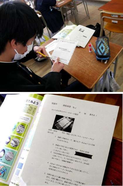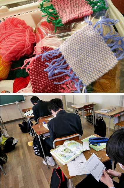 2年生の家庭科では被服の実習を教室でしていました。厚紙に切れ目をいれて、毛糸で布を編んでいきます。完成するとコースターになるんですね。給食で使えそうです。