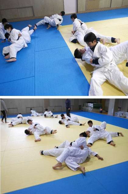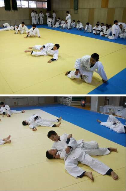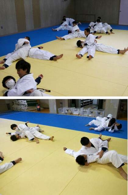 1年生の男子体育では柔道の授業をしています。受身の練習を終えて、寝技の練習です。ぬけだせるかと勝負です。