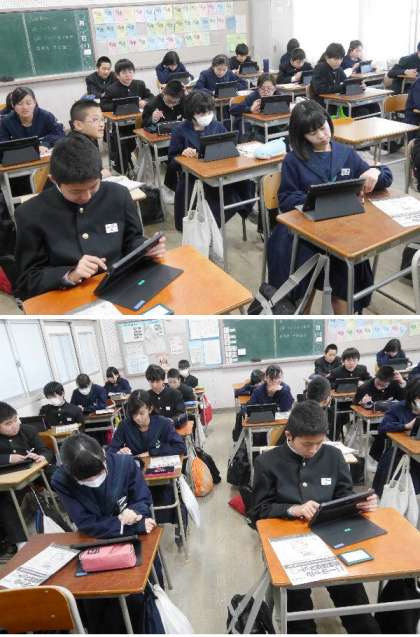 1年生が、教室でタブレットを使っています。ウェブサイトのバーチャル体験をしています。自分の性格や興味を選択すると、自分にあった職業を調べることができます。