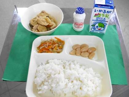 今日の献立は、ごはん、牛乳、関東煮、あまずあえ、大福豆の煮物、乳酸飲料でした。