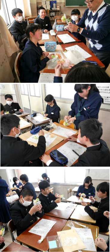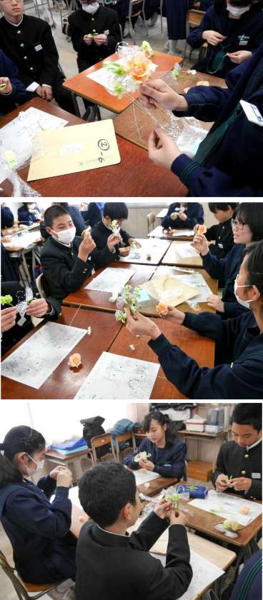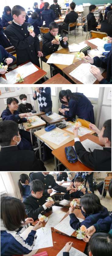 3年生の卒業式まで1ケ月をきりました。1年生が、卒業式の日に3年生の胸に飾られるコサージュづくりをしています。とてもきれいに仕上がっていますね。