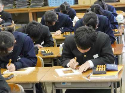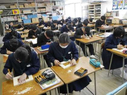 2年生の美術では、カガミ枠の彫刻をしています。こつこつと生徒たちは作業をしています。彫りも深くなってきて立体的になってきました。