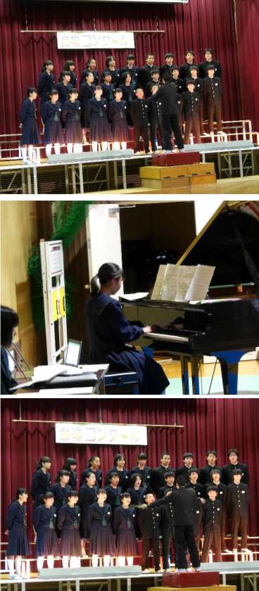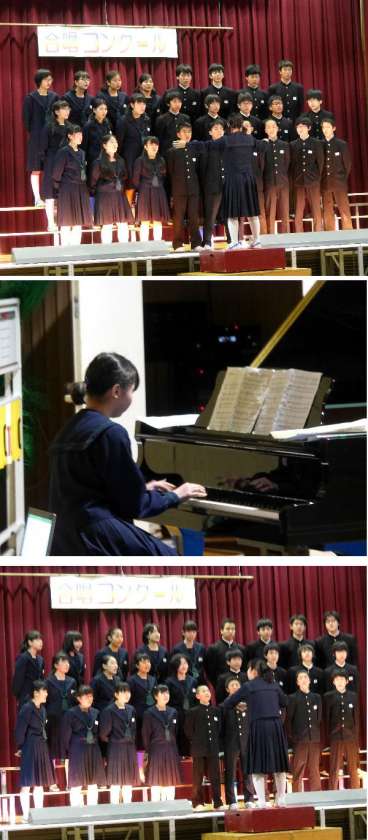 2年各学級が課題曲と自由曲を合唱します。課題曲は「心の中にきらめいて」、1組自由曲は「全力少年」、2組自由曲は「奏」、3組自由曲は「蕾」です。男子と女子がしっかり声をだし、とてもよいハーモニーに仕上がっていました。