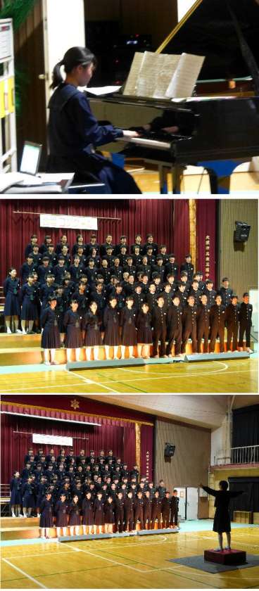 各学級の発表のあと、課題曲を2年生全員で全体合唱をしました。