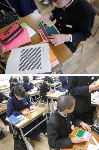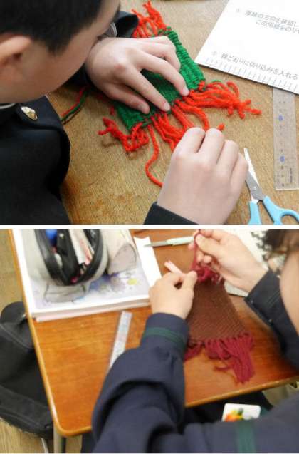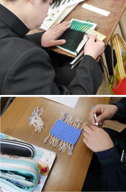 2年家庭科で取り組んできた、機織りで作品が仕上がってきました。最後は淵を処理すると、コースターになります。マイコースター使ってね。