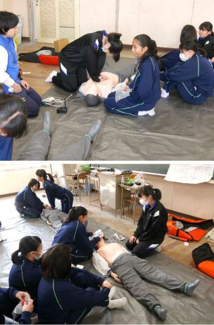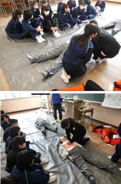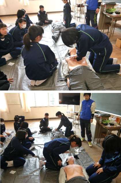2年生の保健体育の授業で、救急救命の人形を使って学習しました。胸部圧迫や人工呼吸、AEDの使い方を実技学習をしています。