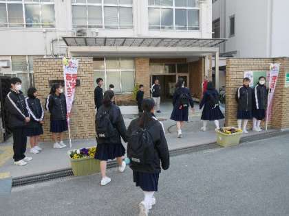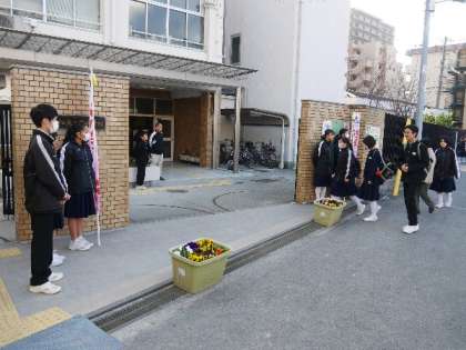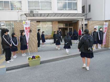 明日は卒業式です。3年生にとって最後の正門でのあいさつとなり、生徒会があいさつで出迎えました。