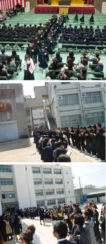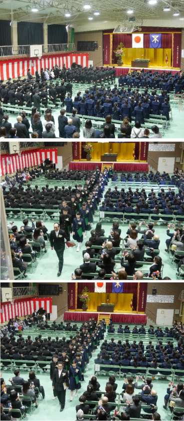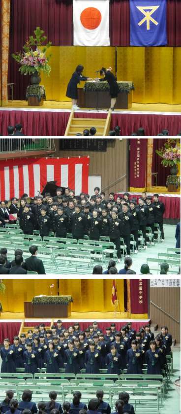 卒業式の最後は、生徒たちの合唱です。卒業生の「旅立ちの日に」、卒業性と在校生の「心の中にきらめいて」、全員で「蛍の光」を歌いあげました。とても良い卒業式となりました。卒業生退場では、それぞれの学級の担任に「ありがとうございました」と感謝の気持ちを言って、堂々と胸をはって花道をあるいて卒業しました。卒業生の皆さん、ご卒業おめでとうございます。