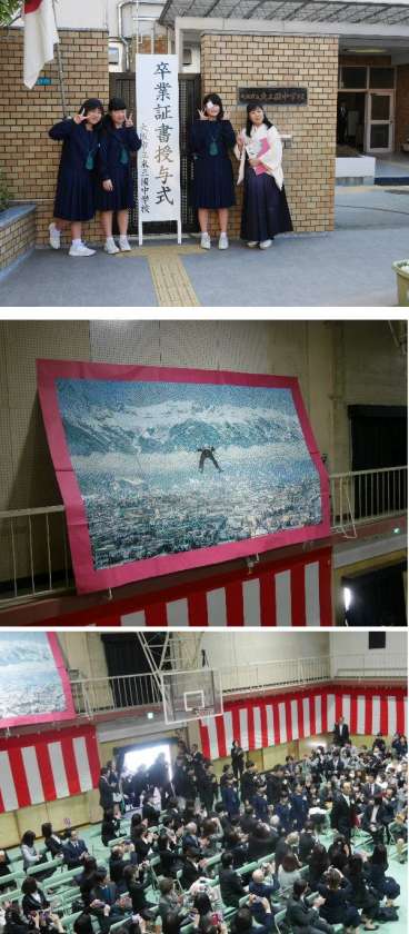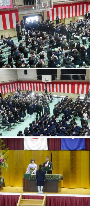第55回卒業証書授与式が、盛大に行われました。中学校3ヶ年の課程を終え、9年間の義務教育が修了です。卒業生はそれぞれの道を歩んでいきます。東三国中学生の誇りをもって、胸をはって卒業式場に入場してきました。卒業生一人一人に卒業証書を手渡すことができ、とてもうれしいです。