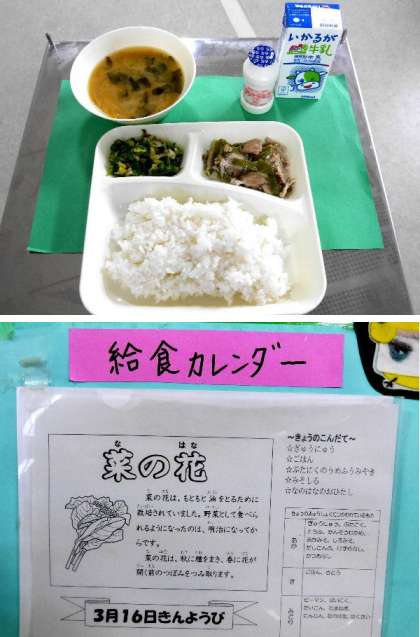 今日の献立は、ごはん、牛乳、豚肉の梅風味焼き、味噌汁、菜の花のおひたしでした。