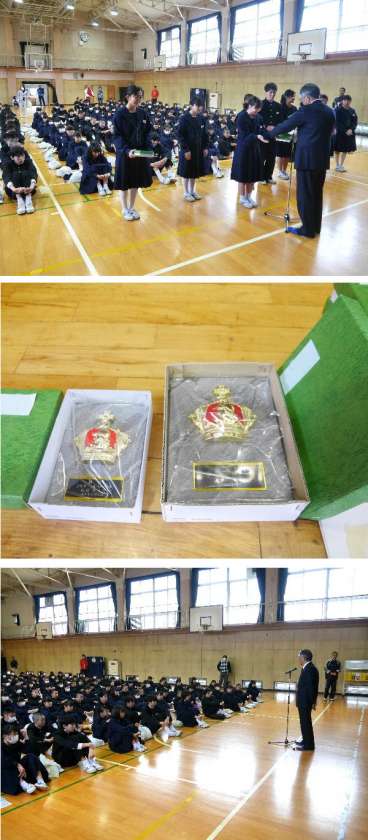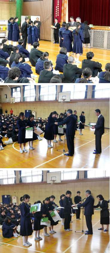 地域の東三国青少年を守る会から会長さんに来ていただき、1、2年の生徒たちが作った標語やポスターの表彰をしていただきました。生徒全員が取り組んだ作品の中から、地域の方々で投票していただき決まった賞を表彰していただきました。金賞と銀賞には楯もいただきました。