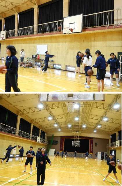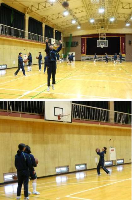 大きなバスケットボールをもって、シュート練習です。走って、ジャンプして、ドリブルしてゴールをねらいます。はつらつと元気いっぱいです。