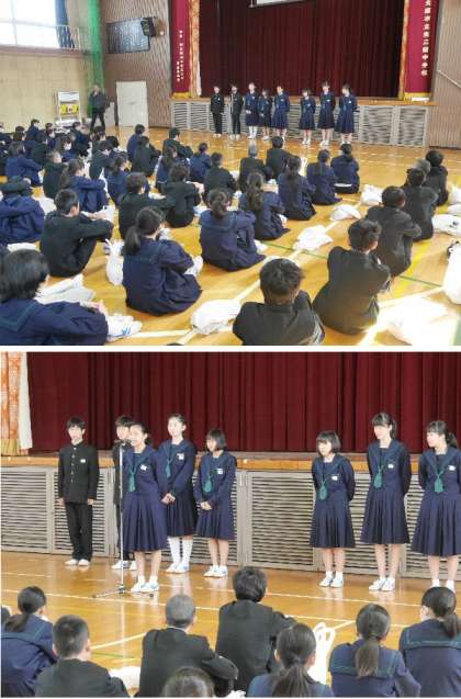 修了式のあと、全校生徒の前で、来週の月曜から出発する東北ボランティア研修の壮行会を行いました。研修にいく8名の代表から決意を表明しました。ぜひ、いろいろな体験を通して学んできてほしいと思います。