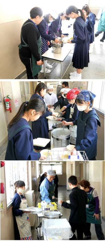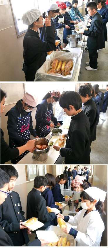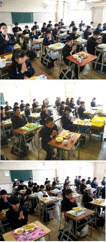 今日から1年生も給食です。小学校とは少し配膳方法がちがうので戸惑ったかもしれませんが、皆そろっていただきますをしました。