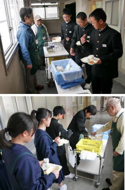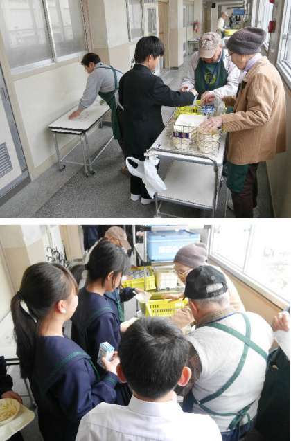 東三国中学校には、給食支援、図書館支援など、毎日たくさんの地域の方々にご支援ご協力いただいています。給食支援では、生徒たちと「こんにちは」と挨拶を交わし、ボランティアさんから声をかける場面も多いです。たくさんの大人の目があり、その交流が温かい雰囲気の学校を作っています。本当にありがとうございます。