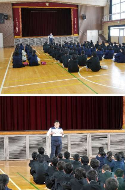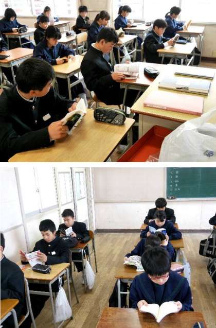 朝の授業前の様子です。1年生は読書タイムで各自が本を読んでいたました。2年生は体育館で学年集会です。いろいろな先生からのお話があります。