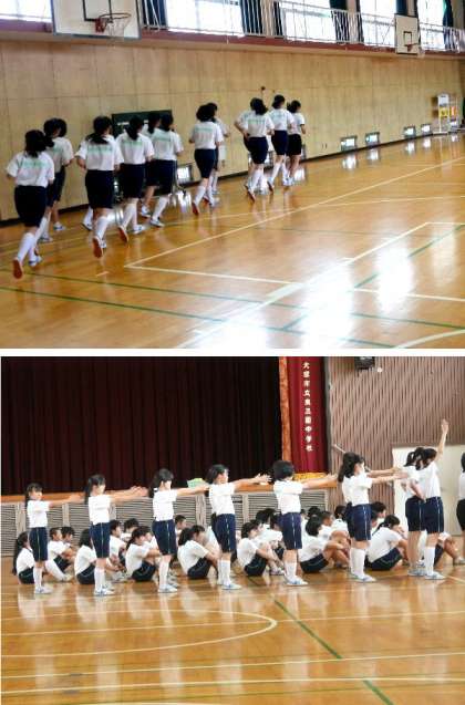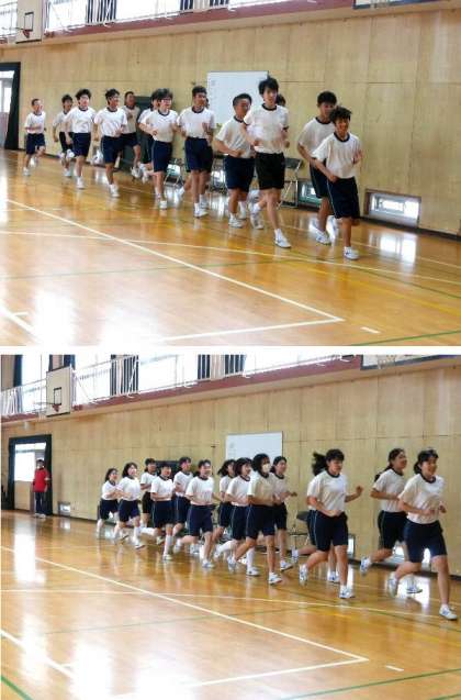 3年生の体育の授業です。最初は男女一緒に整列の基礎練習をしています。きびきびと動いて、よく声をだしてがんばっています。