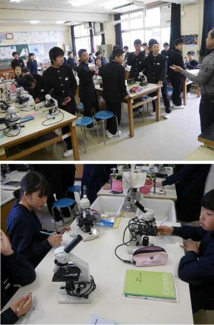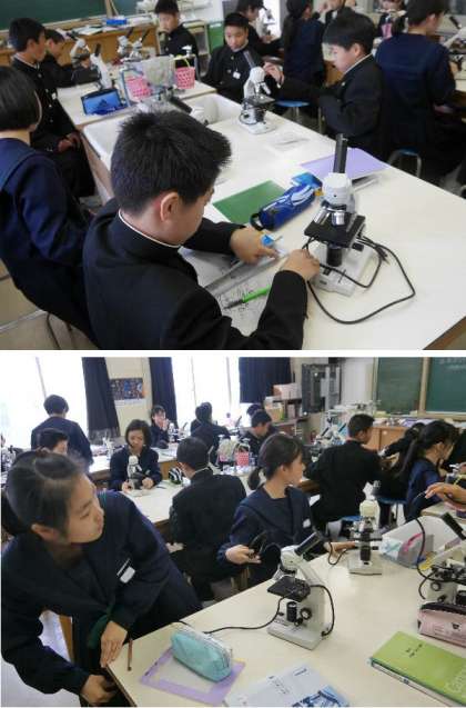 1年生の理科の授業です。理科室で、一人に一台づつ顕微鏡で観察します。今回は顕微鏡の使い方を覚えています。これからの実験観察では必要な機器ですね。しっかりと覚えておきましょう。