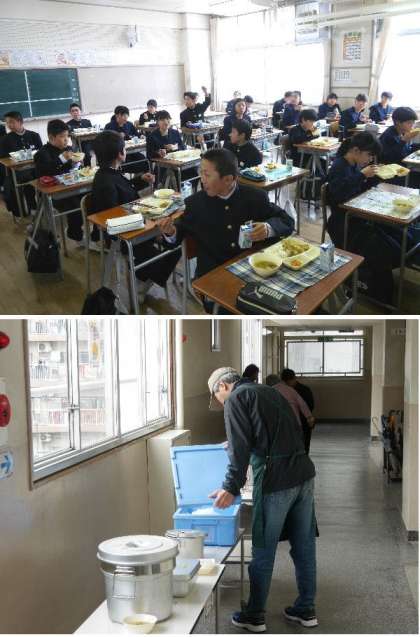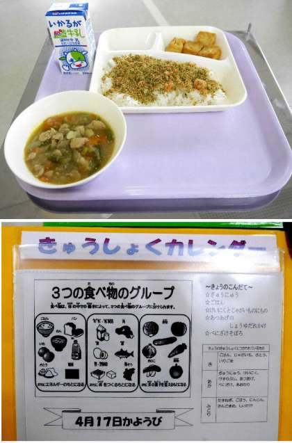 今日の献立は、ごはん、鶏肉とジャガイモの煮物、厚揚げの醤油だれかけ、紅鮭のそぼろ、牛乳でした。そぼろがご飯にあって食がすすみますね。