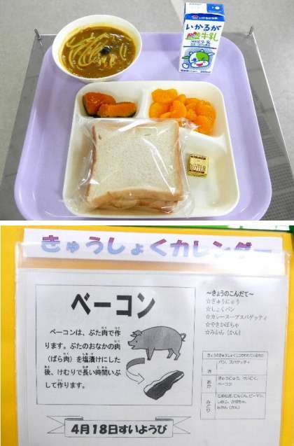 今日の献立は、食パン二枚、牛乳、カレースープスパゲッティ、焼きかぼちゃ、缶みかんでした。1年生もおかわりでたくさん食べました。