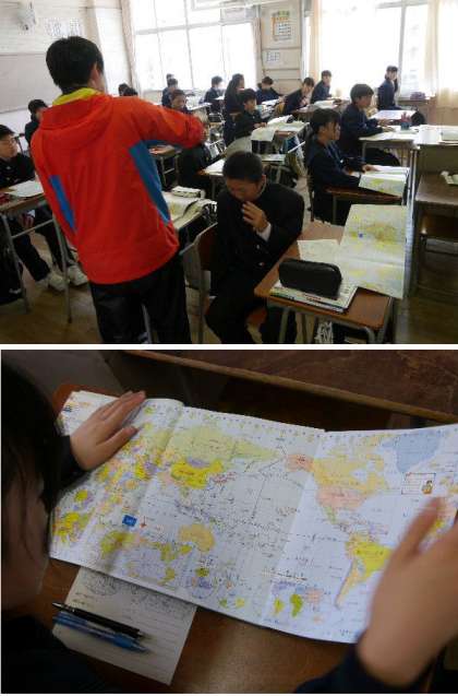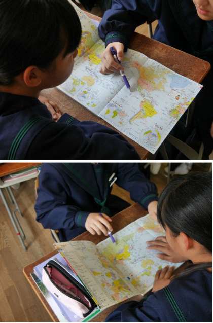 1年生の社会は地図をみながら地理の学習です。お互いにわからなかった人に教えあっています。いってみたい国はありますか。