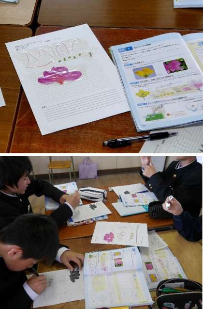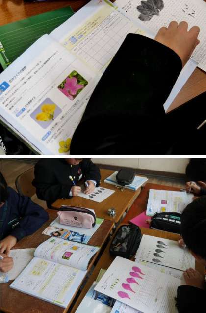 1年生の理科は、採取した花を分解して台紙にはりつけて観察しています。はなびら、がく、おしべ・・・いろいろなものから構成されているんですね。