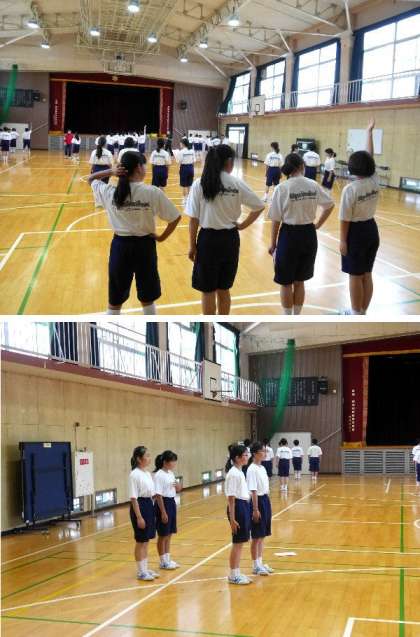 1年生の体育の授業です。グループに分かれて集団行動の練習をしています。がんばっています。
