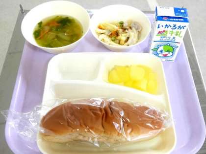今日の献立は、黒糖パン、牛乳、マカロニグラタン、レタスのスープ、缶リンゴでした。