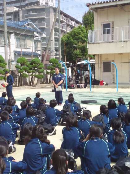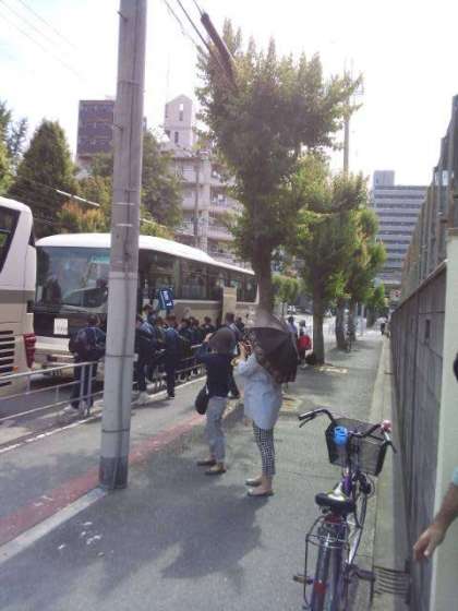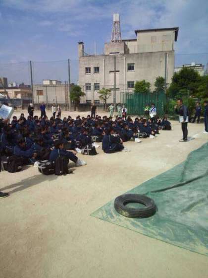 諸注意の後、一泊移住の目的「絆を深めて協力し、楽しい一泊移住にしよう」が生徒の代表より力強く宣言。その後、団長である福崎教頭先生のお話、秦先生の諸注意が終わり3台のバスに分乗し、一泊二日の初めての大きな行事がスタート。
