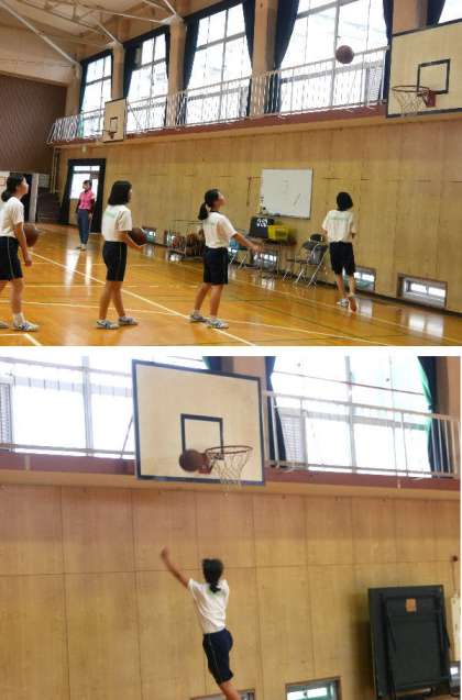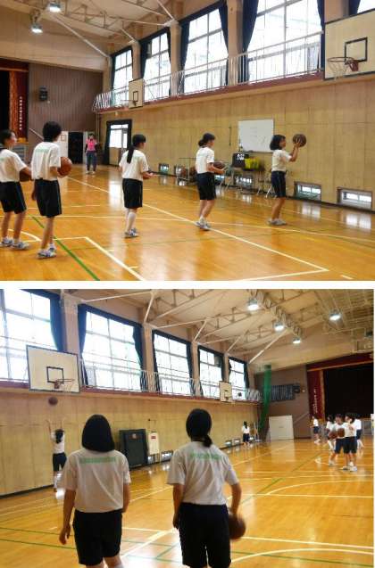 3年生の女子が体育館でバスケットボールのシュート練習です。なかなか入りませんね。むずかしいです。