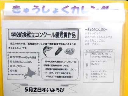 今日の献立は、とうもろこしごはん、牛乳、鮭のちゃんちゃん焼き、スープカレーでした。今日もおいしかったですね。ごちそうさまでした。