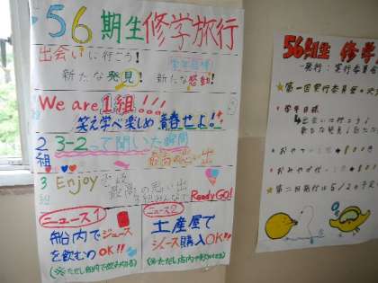 3年生の廊下には、修学旅行の壁新聞が張り出されていました。修学旅行の目標やが学級のスローガンも決まってきました。楽しみですね。