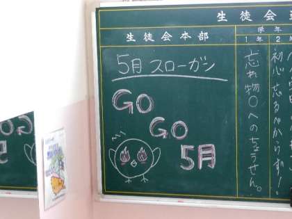 生徒議会で決まった今月のスローガンは「Go Go 5月」です。年度はじめなので、学級で皆と仲良くなって、いいスタートをきりたいとのことでした。