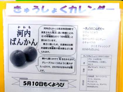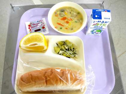 今日の献立は、パン、牛乳、コーンクリームシチュー、キャベツのひじきドレッシング、河内ばんかんでした。
