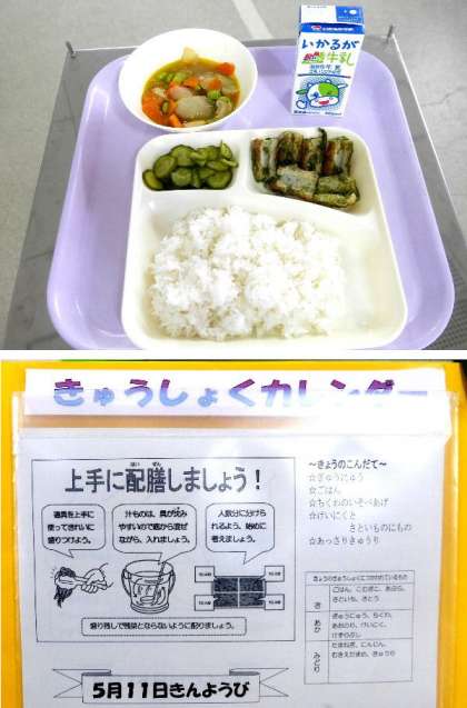 今日の献立は、ごはん、牛乳、ちくわのいそべ揚げ、鶏肉と里芋の煮物、あっさりきゅうりでした。