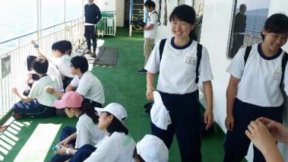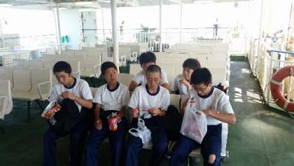 フェリー船内で、自由行動です。ゲームをして楽しんでいます。