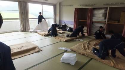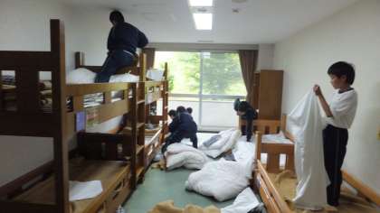 部屋員で協力しての布団敷き。どの部屋が早くできるか競争してるようでした。
