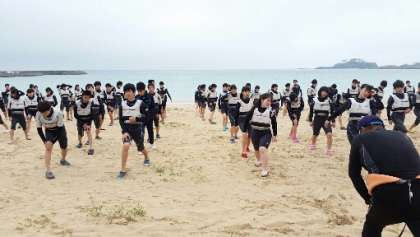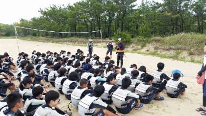 パドルボード、ビスケットボード、シュノーケリングに分かれ、学級ごとに順番に体験します。