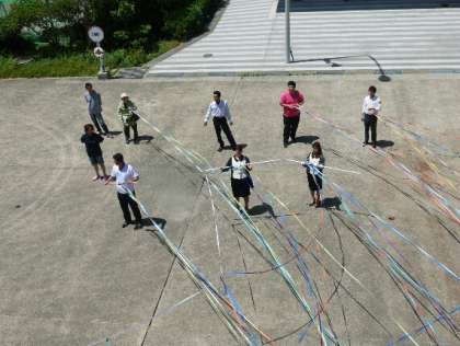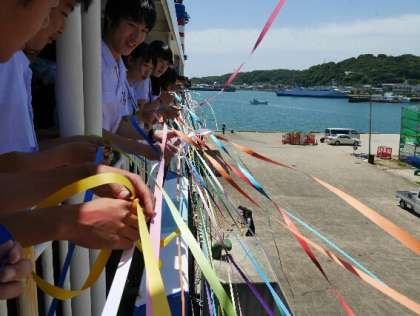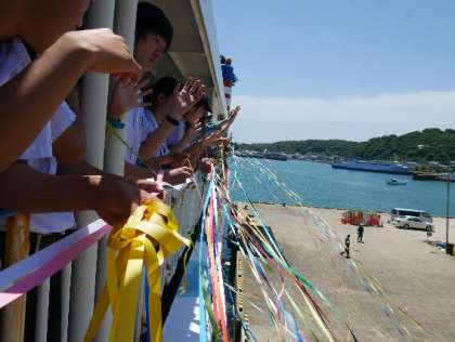 フェリーで出発しました。お見送りの方々と紙テープでお別れです。