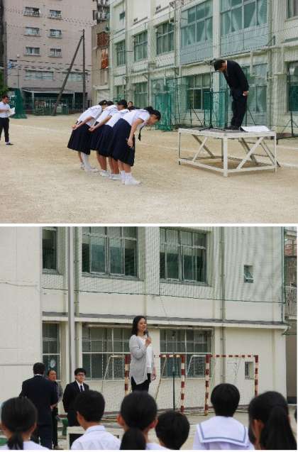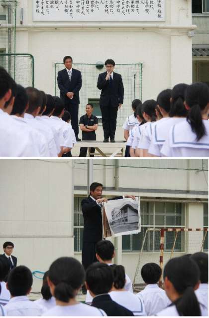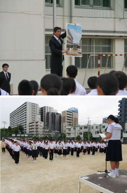 また、明日の創立記念日にあわせて、校長先生から東三国中学校創立についてお話しました。東三国中は昭和36年に三国中の分校としてスタートし、昭和37年に独立し開校しました。その年の5月29日に開校式・校舎落成式を行い、創立記念日としています。昭和39年に第3期校舎鉄筋4階建が完成しました。当時は学校の周りは緑が多く、校歌にも「緑こき地にそびゆる学舎」と歌われおり、和歌さを象徴してスクールカラーは緑に決められました。昭和45年に、地下鉄御堂筋線が開通し、正門が今の東門だったのが変更になりました。