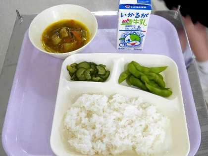 今日の献立は、ごはん、牛乳、肉じゃが、きゅうりのカツオ梅風味、枝豆でした。